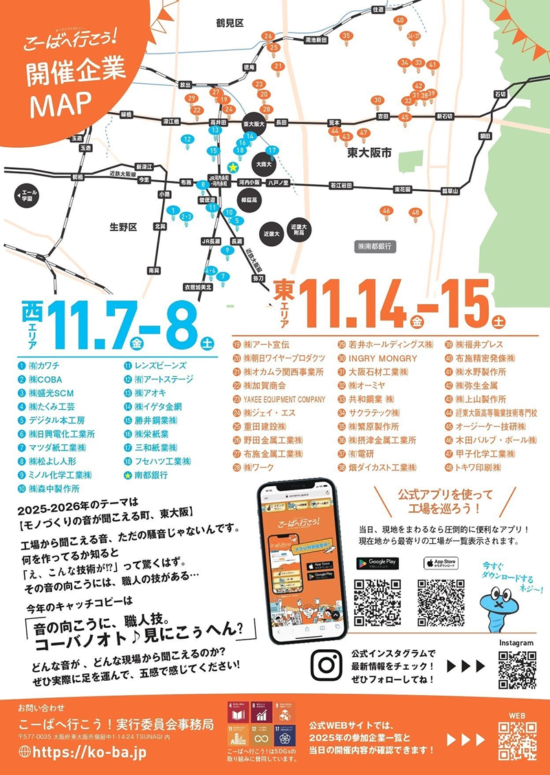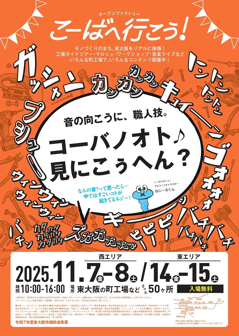 日頃見ることのできない工場内部の見学ツアーやモノづくりワークショップ、飲食などを通じて、こーば=交場として“モノづくりのまち東大阪”の製造現場を身近に体感してもらおうと市内モノづくり企業などが実施しているイベントです。