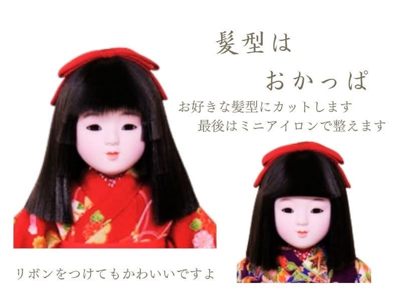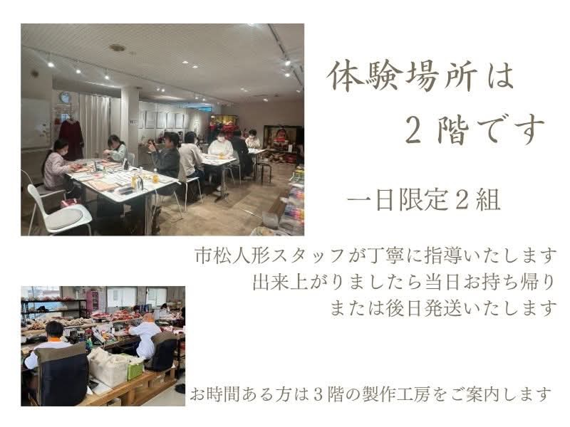 人形は、12号(尺二)サイズ:大きさ約47㎝、座高約35㎝のお座りの市松人形です。髪の毛もカットします。出来上がったお人形はお持ち帰りまたは発送させていただきます。体験後時間ある方は、3階の工房見学にもご案内させていただきます。