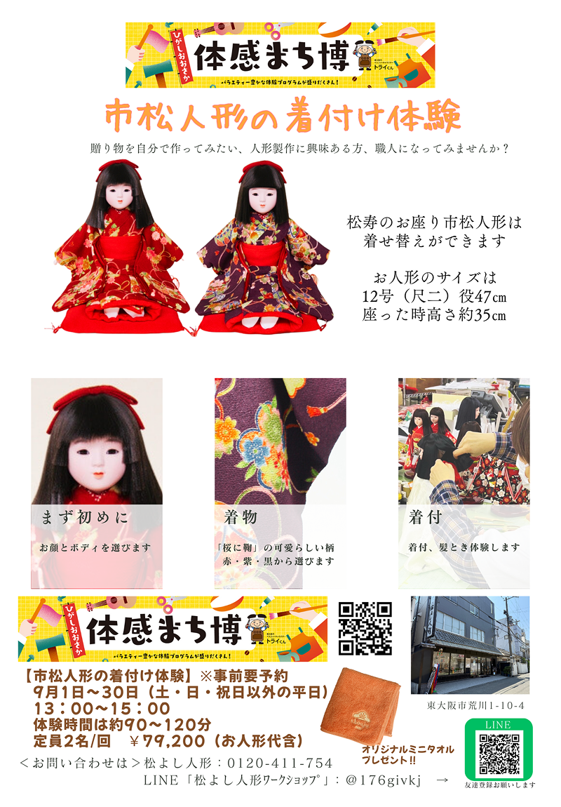 普段のワークショップとは異なり、工房スタッフ指導のもとで職人と同じように着付をして人形を完成させます。