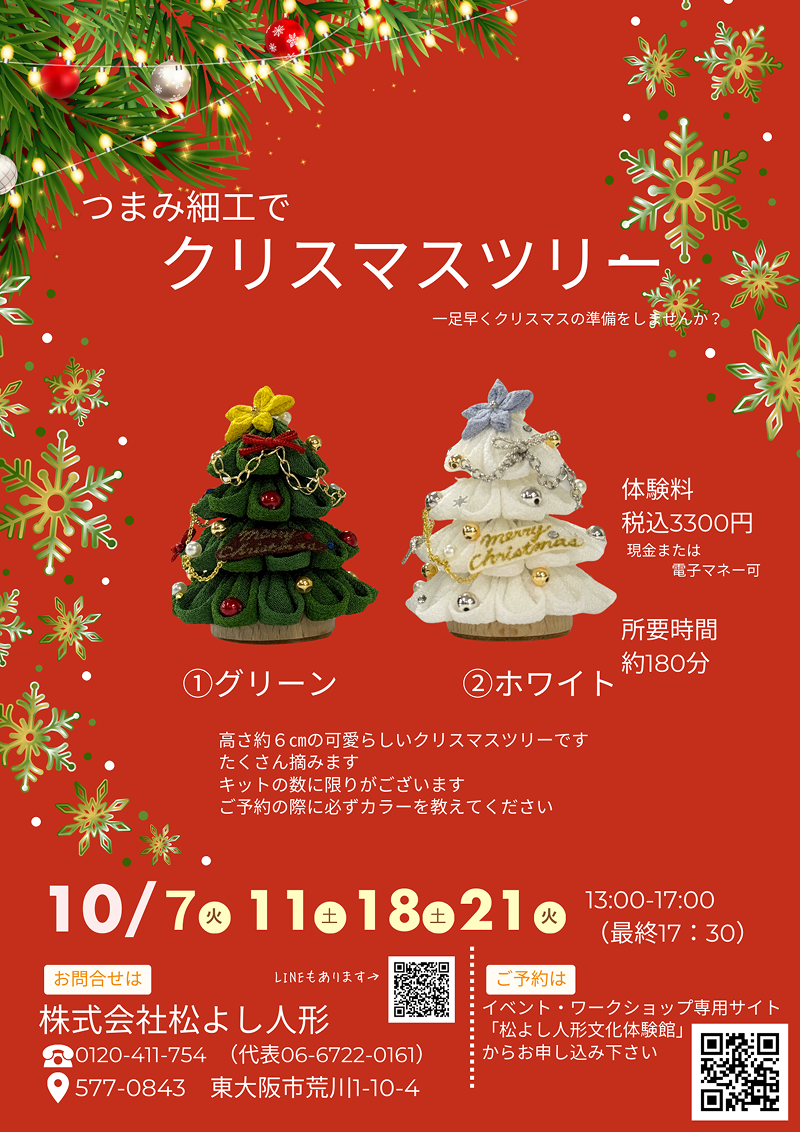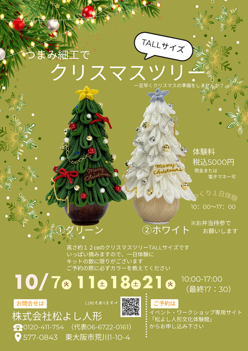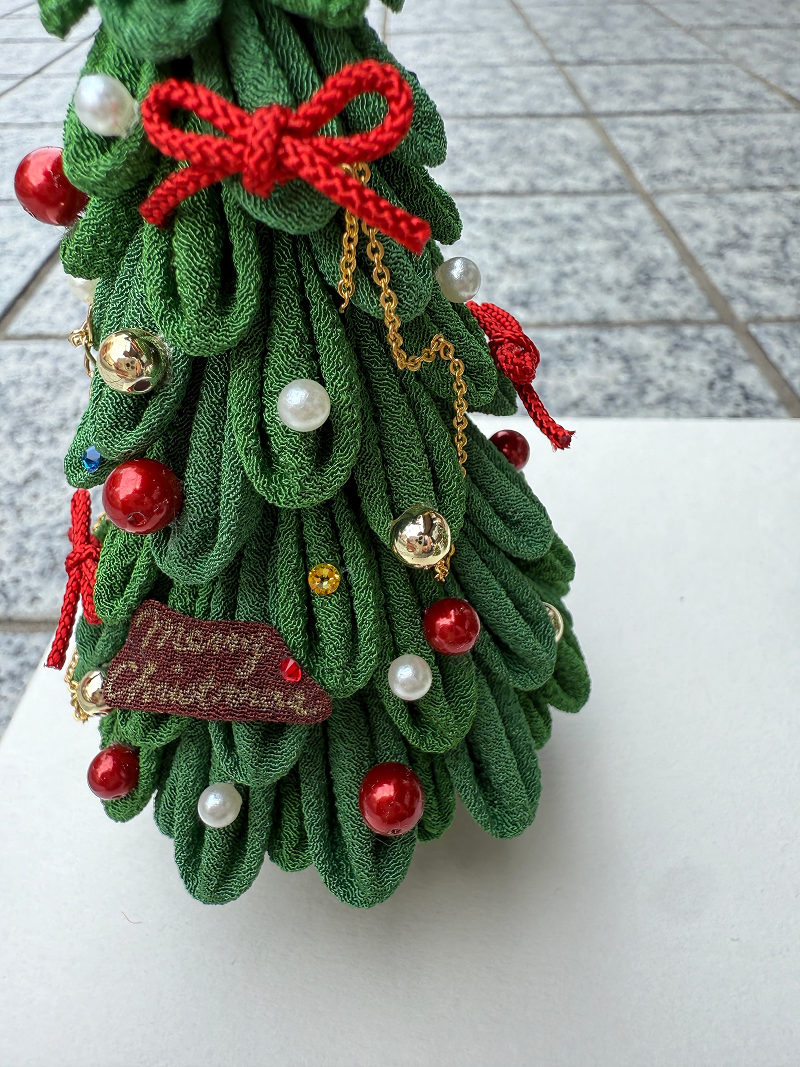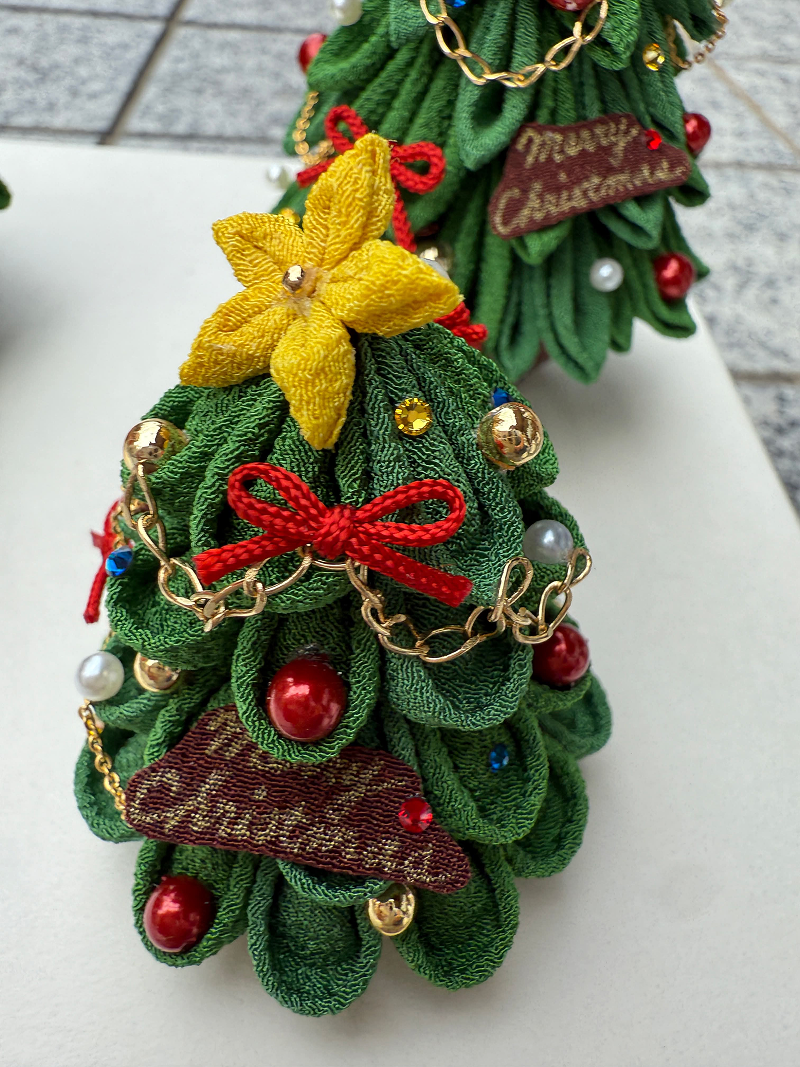 つまみ細工です。いっぱいいっぱい摘まんでいただきます。つまみの形は丸つまみ(写真①グリーン)と剣つまみ(写真②ホワイト)のどちらか当日お選びください。高さは約12㎝です。もみの木ができるとテンションすごく上がります。また飾り付けも見本を参考にオリジナルで考えていただきますのでとても楽しいですよ。