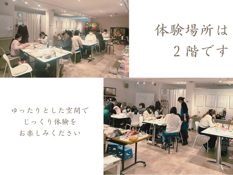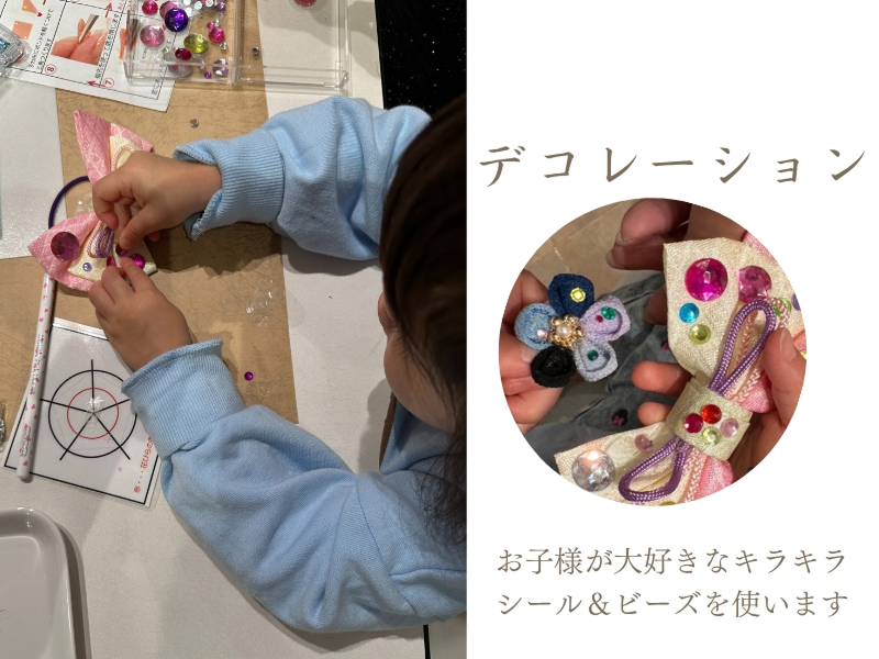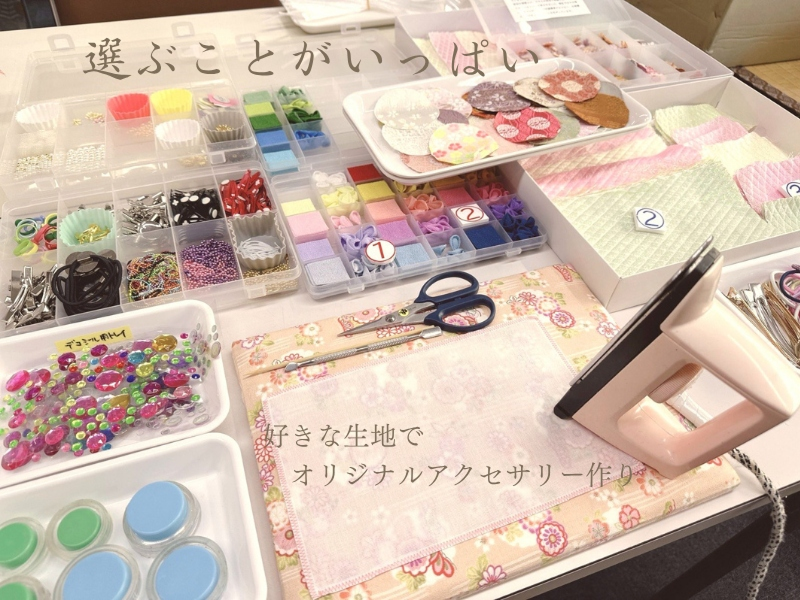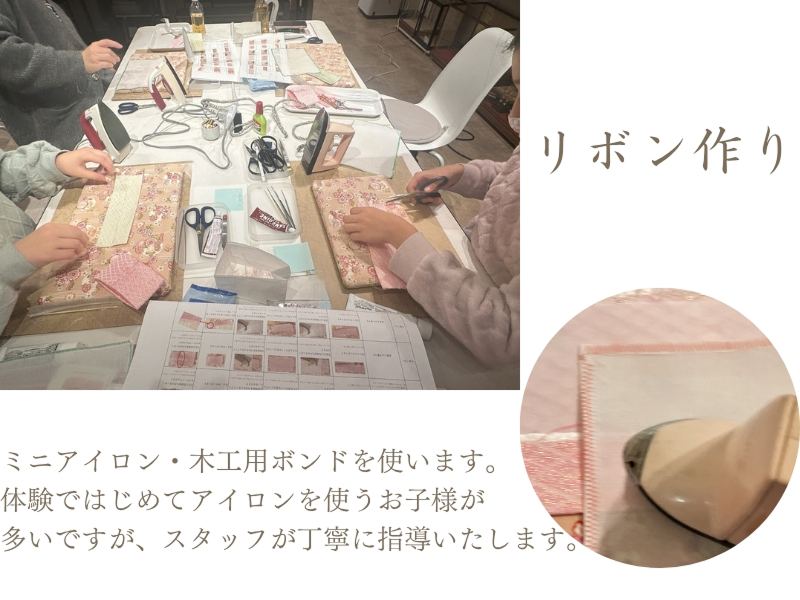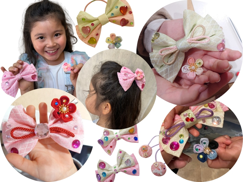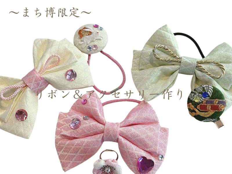 人形の衣裳に使う生地と工房で使用している道具でリボンを作ります。 お子様が大好きなビーズなどで可愛らしくアレンジします。 そしてワンポイントに日本の伝統工芸「つまみ細工」又はくるみボタンでアレンジ自由なアクセサリーを作ります。ヘアゴムやクリップ、指輪など選べます。体験された方へオリジナルミニタオルをプレゼントいたします。