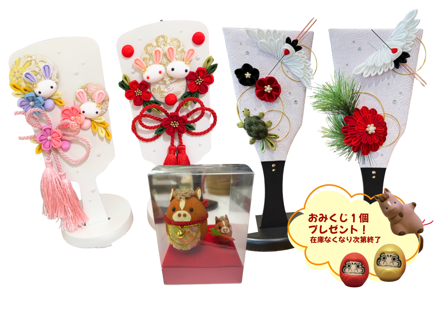 お正月飾りを体験された方に、おみくじ付「のぞきウマ」または「だるま」金または赤のどれか1つをプレゼント!(在庫なくなり次第終了)
