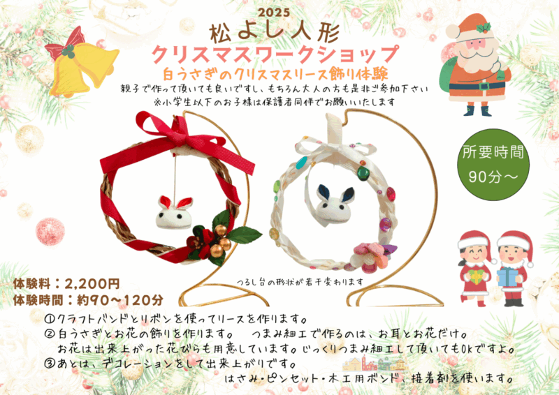 夏休み企画で好評だった「白うさぎとお花」でクリスマスリースを企画しました。親子で作って頂いても良いですし、もちろん大人の方も是非ご参加下さい。※小学生以下のお子様は保護者同伴でお願いいたします。