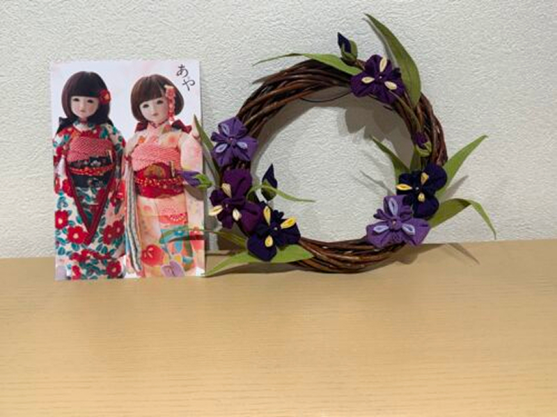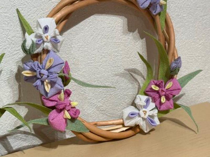 直径約15㎝のリースです。今回は、色々な摘み方で作る菖蒲に