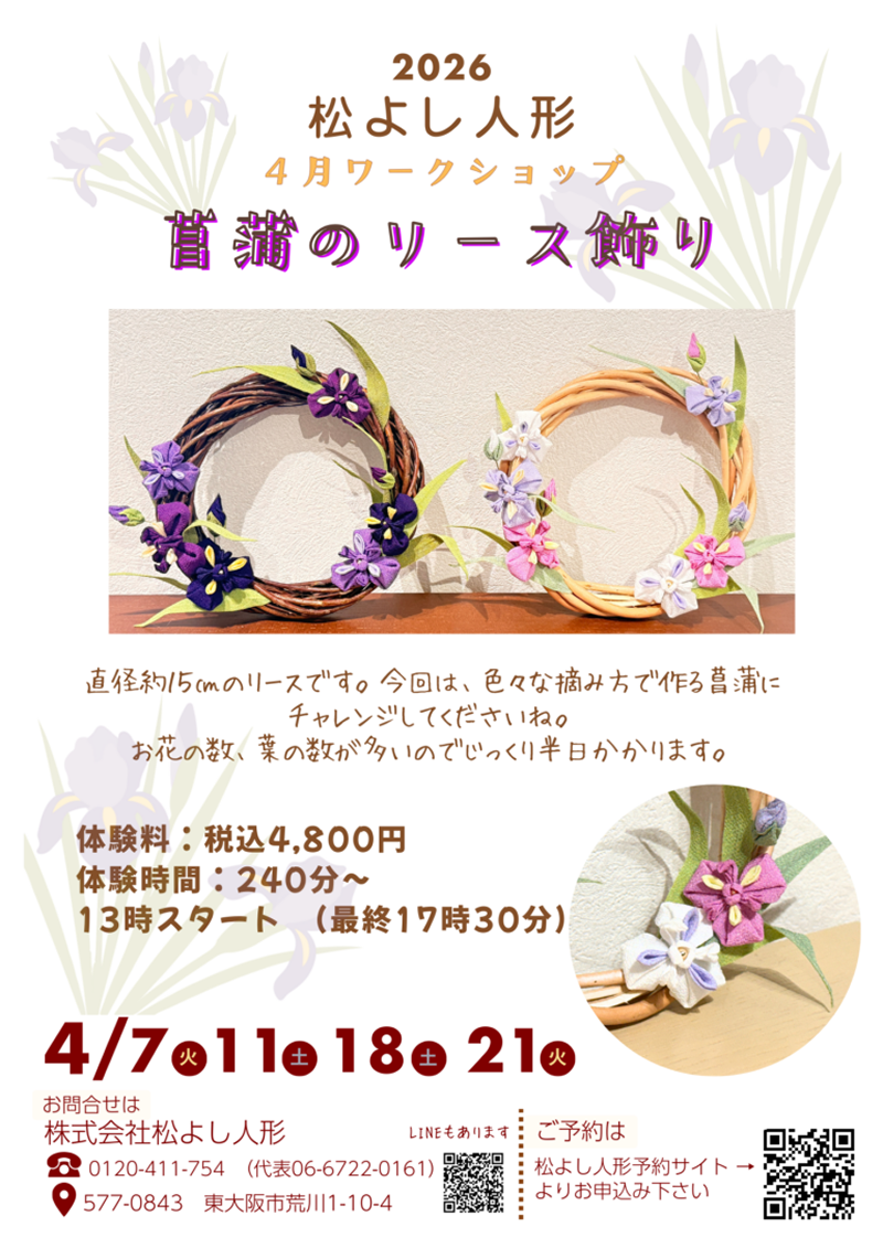 メニューで「菖蒲のリース飾り」などを選択し、ご希望の日程をクリックして申込みをお願いいたします。
